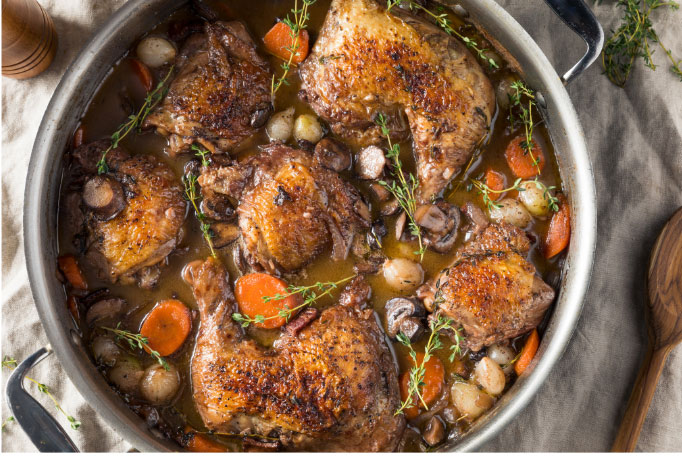 You can't beat the convenience of a casserole or stew and chicken thigh cutlets are the perfect choice for this cooking method. Cooking low and slow, in a tasty sauce, allows the chicken to absorb more flavour and the meat to fall off the bone. Think of classic chicken casserole recipes - French coq-au-vin and Italian chicken cacciatore. Both are humble peasant dishes full of delicious flavours. They make a perfect family weekday dinner and are delicious simple recipes to cook when you're entertaining.