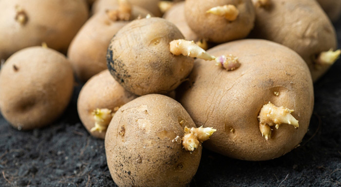 Potatoes should be stored in a cool, dark, well ventilated place, ideally in a paper bag or cardboard box. Potatoes exposed to warm temperatures may begin sprouting in an attempt to grow. Sprouts should always be cut away before cooking. Whilst stored, avoid exposure to light, as this can cause a toxin called solanine to develop, which can taste bitter and turn the potatoes green. These green patches should be cut away before cooking.