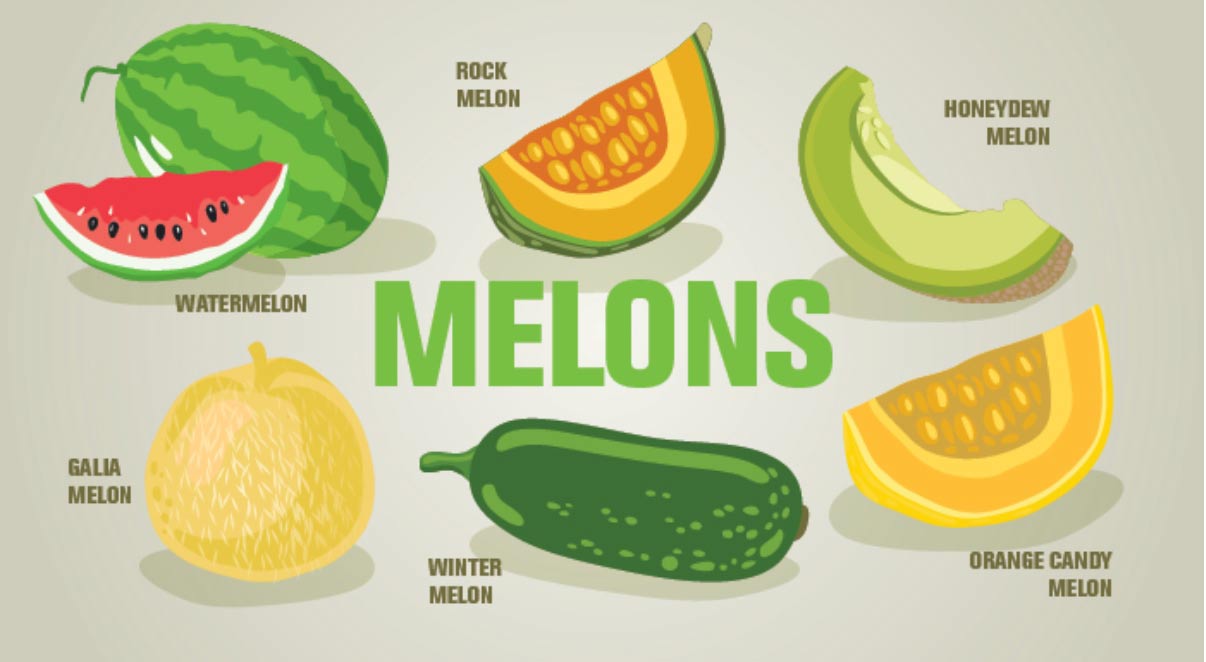 Melons are full of water, making them refreshing and hydrating in hot weather. Despite their sweet taste, most melons contain very little sugar, so can be consumed freely even on a weight loss program. Melons have a low salt, low fat and low cholesterol content. They are a good source of vitamins and minerals.