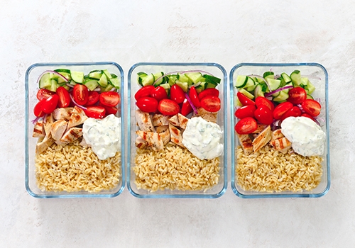 Fill up single serve containers with meals like baked chicken and rice. Then, you can grab and go whether it’s for breakfast, lunch or dinner. An example of this would be salads. You can prepare a simple couscous salad and cooked chicken breasts on Sunday, and then have it for lunch on Monday and Tuesday.