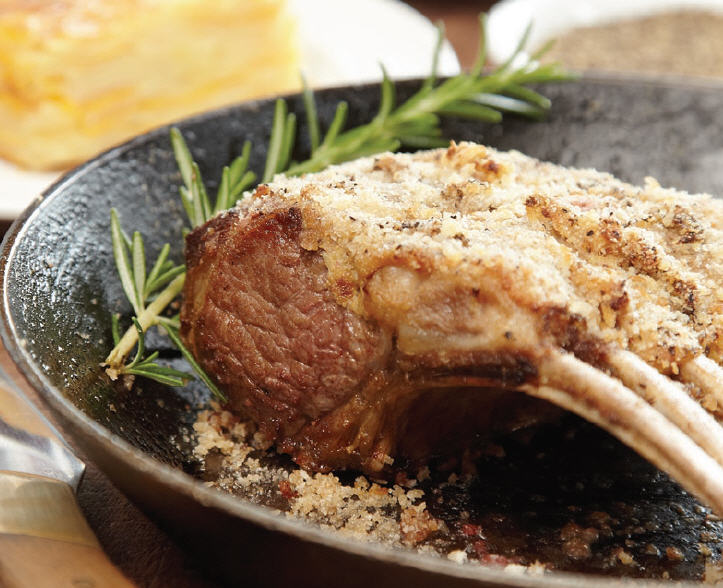 Clean the lamb racks and portion to three to four cutlets per serve. Sear racks until golden brown on each side. Add crust by spreading over lamb, then bake at 180°C for 15-20 minutes. Rest for 5 minutes.