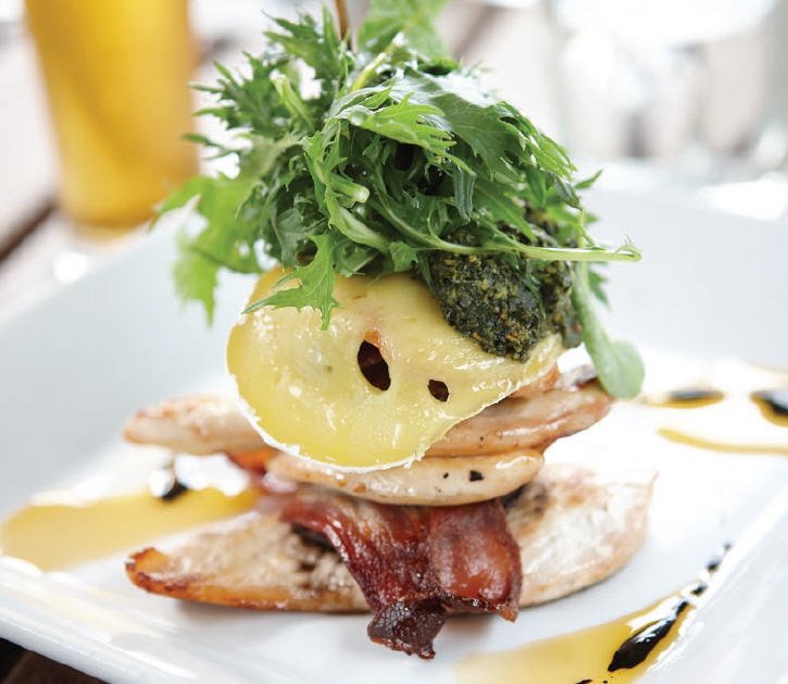 Compile four towers of chicken, mushroom and bacon in that order, with three slices of chicken in each tower. With the last piece of chicken at the top, push skewer through centre to hold. Place in 180°C oven for another 7 or 8 minutes.