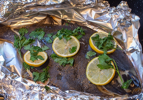 Flounder is a flat fish, it’s soft and fleshy and bakes nicely in the oven. So, you can just pop on some lemon and any herbs you have on hand, or growing in your garden with some olive oil. Bake it in the oven for around 15 minutes and it’s completely ready to go. You can serve it with a salad and a little bit of rice for an easy, quick and affordable meal.