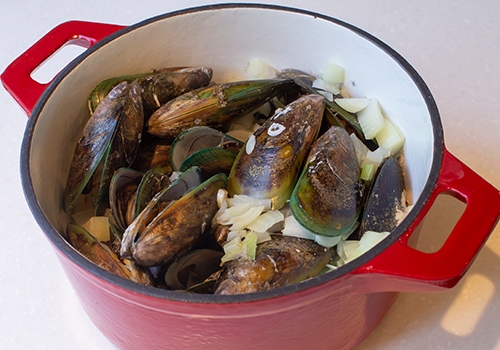 They’re super easy to cook. All you need to do is put an inch of chicken or vege stock or even some white wine into a pot big enough to hold all the mussels. Throw in some onion and garlic as well, and then put on the stove on a high heat. Once the liquid is boiling, steam them for a few minutes and then stir them all up. Discard any that haven't opened. And there's a dinner that's easy, cheap and tasty!