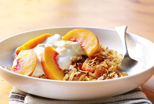 To serve mix in extra yoghurt to reach a desired consistency. Stir through toasted flaked almonds, leaving a few for garnishing. Serve immediately in bowls with the reserved peach slices, a drizzle of honey if desired and a sprinkling of flaked almonds.