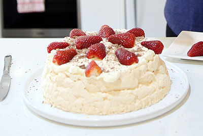 Scatter the strawberries around the top of the pavlova.