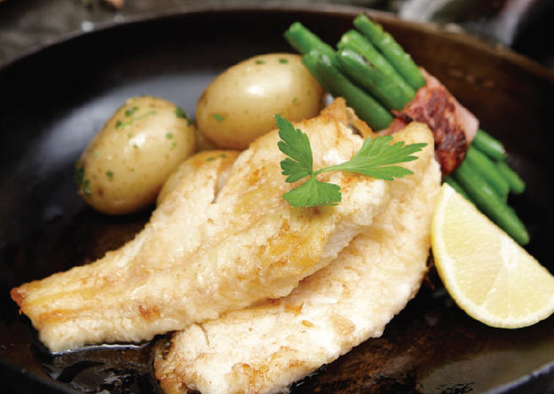 Dust the fish fillets with the seasoned flour. Heat a pan with a splash of oil. Place fillets into pan with a knob of butter and brown on each side (3-4 minutes).